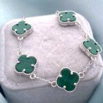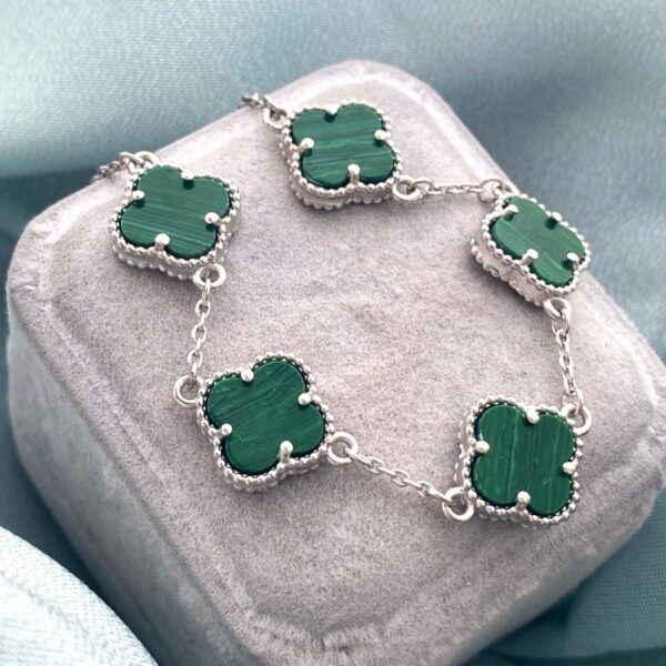 Вишуканий срібний браслет із п’ятьма декоративними елементами у формі чотирилистника — символу удачі та гармонії. Вставки з глибокого зеленого малахіту ефектно переливаються у світлі, підкреслюючи природну красу каменю. Ажурна обробка країв надає прикрасі витонченості й завершеності.